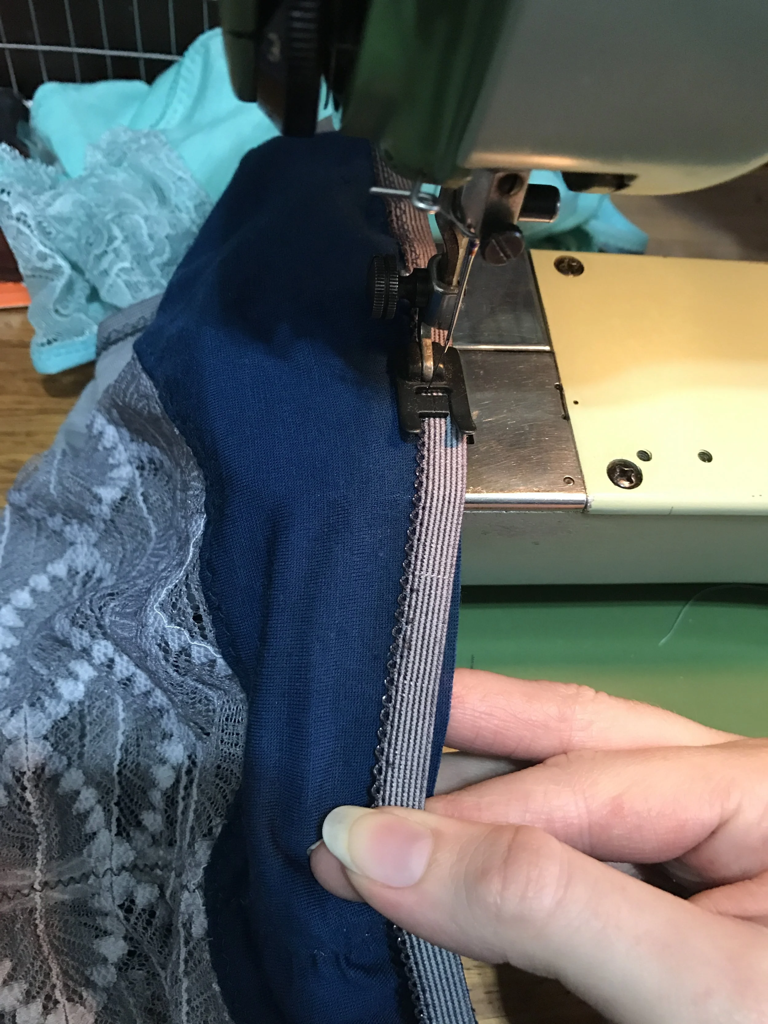Staystitch the sides of your gusset to the front piece, then sew the side seams together. I'm going to give you super vague elastic instructions here, because it's going to be different for every body/booty, type of elastic, time of day (possibly kidding on that last point...) For picot elastic, align the bottom (plain) edge with the edge of your fabric, and use a medium-length zig zag stitch (mine's 2 wide and 2.75 long, for reference. This too depends on your fabric and elastic, but it's okay because this pair's a test!). Pull gently on the elastic as you sew, keeping it taunt. You're not looking for gathers, here - and don't forget that the panties are already 10, 20, or 30 percent smaller than you are. The elastic will definitely function to hold the panties on your body, but its main function is to hold the edges of the fabric flat against your body. Don't go crazy with the stretching! For the legs, I generally apply almost no stretch to the gusset area, and then concentrate a bit of extra stretch over the front leg curve to help it lie flat. To finish the picot elastic, trim any excess seam allowances down (I use my trusty duckbill scissors) and then flip it and stitch down again.