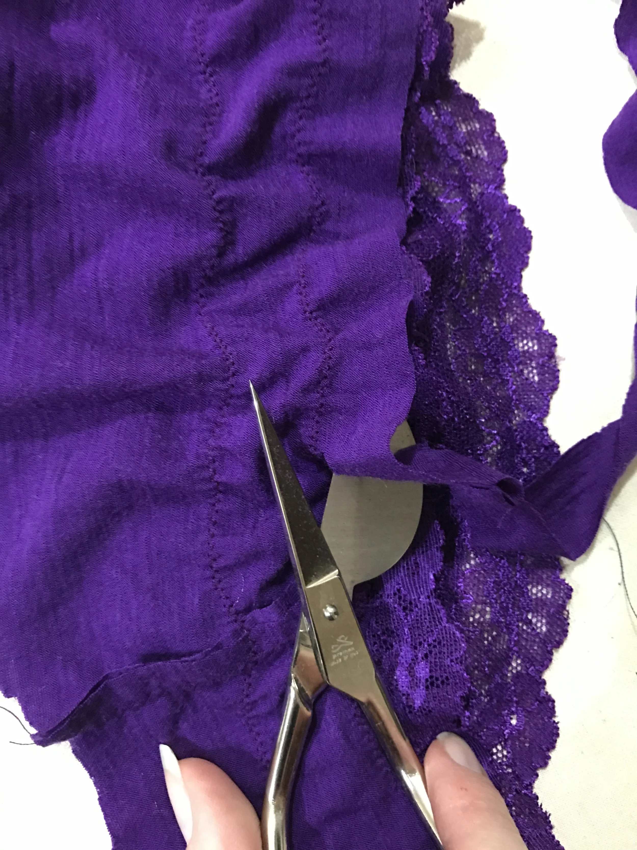 Using either duckbill applique scissors or very sharp snips, trim the excess fabric as close as you can to the zig zag stitches. What is left will be a lace partially overlayed on the panty fabric, and partially overlayed on your skin. How pretty!