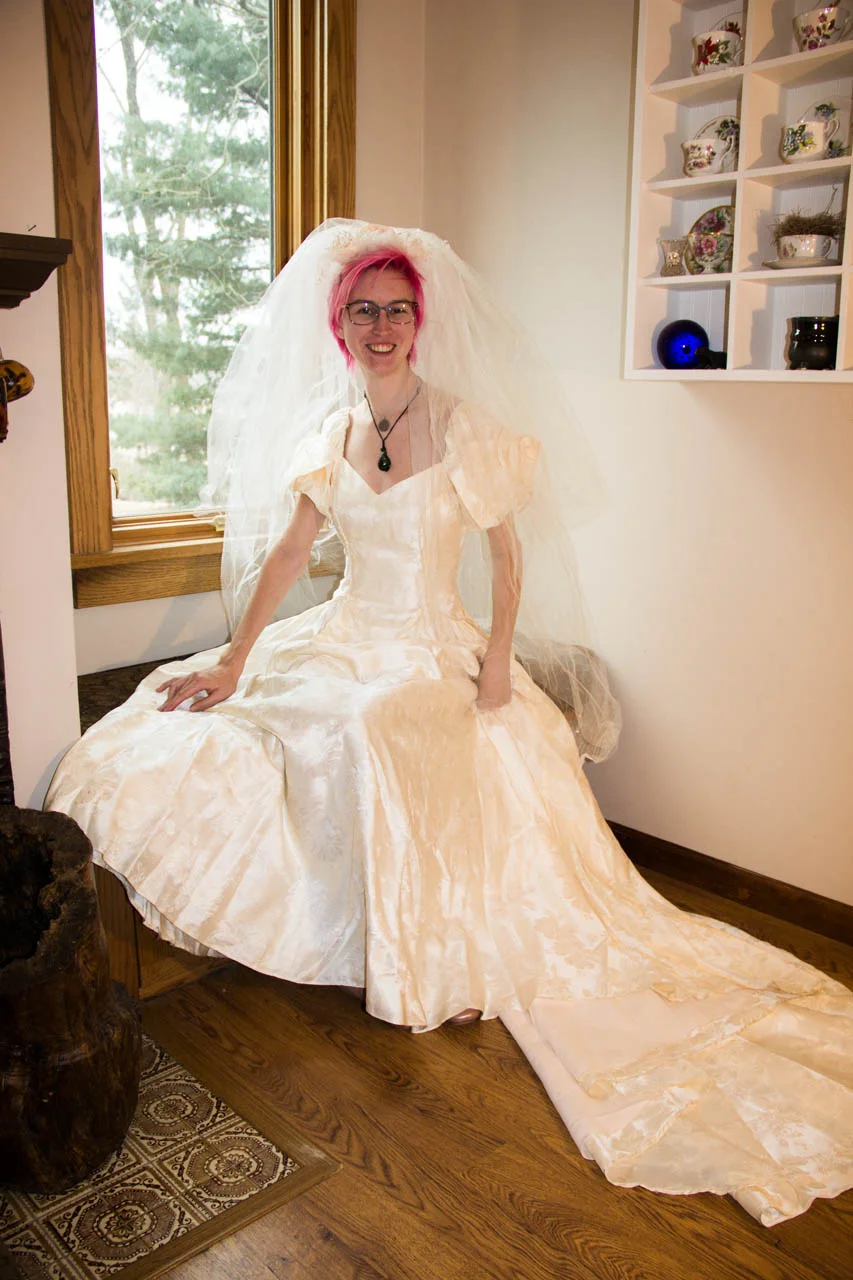 While I was home in February, I took advantage of the opportunity to try on my mom's wedding dress and take some photos of the inside. From the looks of the dress (combined with what my mom can remember)- it storebought and altered to fit her. She was about the same size as me, although quite a bit shorter. The dress is a thick brocade and you can see how much it's been taken in at the side seams in the photo above. It's underlined in a powder pink fabric to give the whole thing a bit of warmth which I thought was very clever.