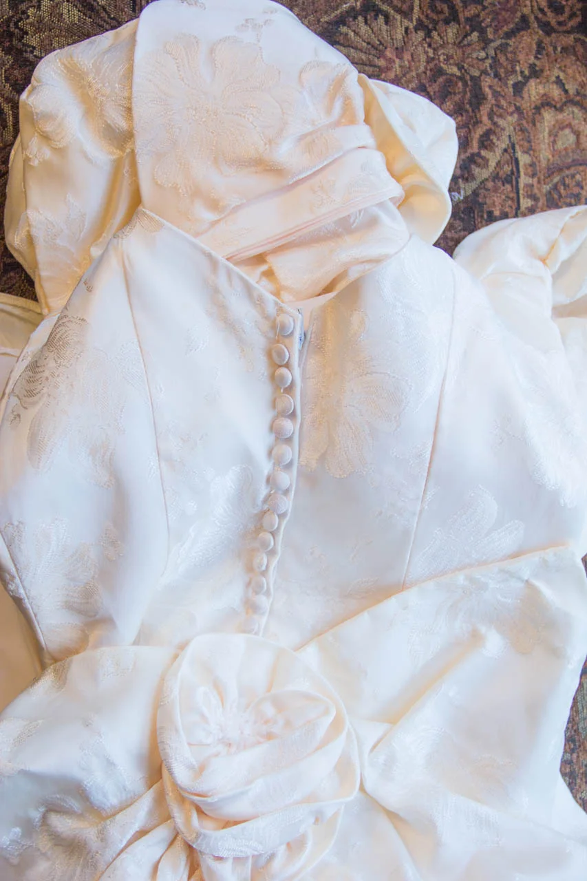 As you can see, it comes with a veil as well as a pretty fabulous train. The shoulders are elasticized, and the butt bow (for lack of a better term) has snaps on one side and is permanently attached on the other; you snap it in place after you zip the dress up.